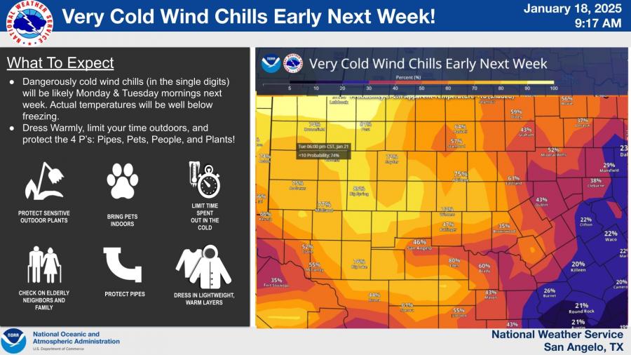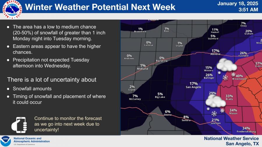 The National Weather Service also noted a low to moderate chance for light snowfall Monday night into Tuesday morning, particularly in areas east of San Angelo, such as Brady and Brownwood. Accumulation is expected to remain under one inch, though forecast uncertainties remain.