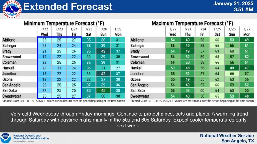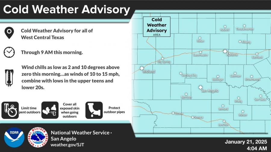 SAN ANGELO, TX — A cold weather advisory remains in effect for West Central Texas, with wind chills dropping as low as 2 degrees above zero early Tuesday morning, according to the National Weather Service.