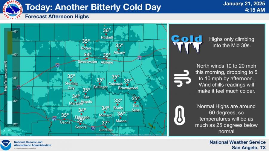 Bitterly cold conditions will persist throughout the day, with highs struggling to reach the mid-30s. North winds of 10 to 20 mph in the morning, tapering to 5 to 10 mph by afternoon, will amplify the frigid feel.