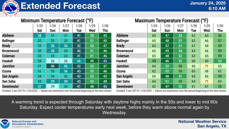 A warming trend is expected through Saturday, with daytime highs reaching the 50s and lower to mid-60s. Cooler temperatures are forecast early next week, but conditions will rebound to above-normal highs by Wednesday.