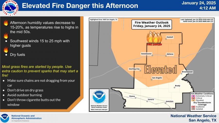 SAN ANGELO, TX — Breezy southwest winds, low humidity, and dry fuels are creating elevated fire weather conditions across West Central Texas today, with the Concho Valley, Big Country, and Heartland areas identified as critical zones.