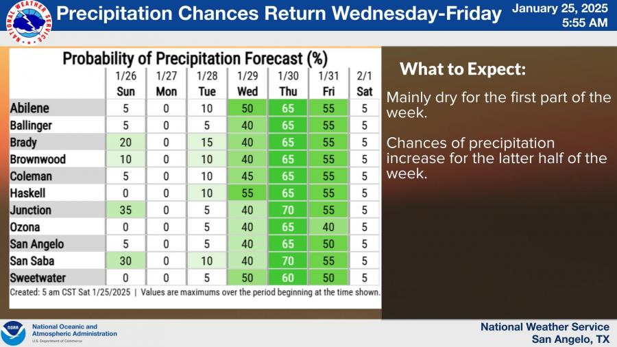 Chances of precipitation are expected to increase in the latter half of the week, with rain probabilities peaking at 65% for the San Angelo area on Thursday. The early part of the week will remain dry, offering a brief respite from the wet weather.