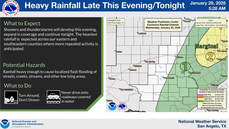 Heavy rainfall is also forecasted to develop Wednesday evening, expanding in coverage and continuing into the night. The heaviest rainfall is expected in eastern and southeastern counties, where repeated storm activity could lead to localized flash flooding of roads, creeks, and low-lying areas. Avoid driving through flooded roads.