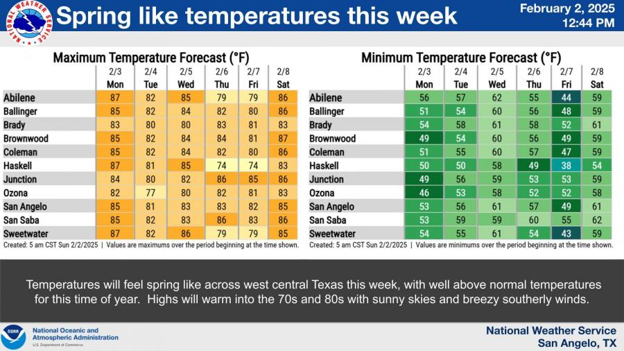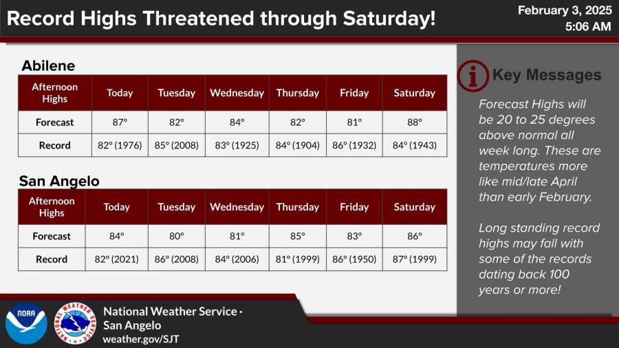 SAN ANGELO, TX – Unseasonably warm temperatures will dominate West Central Texas this week, with multiple days of record or near-record highs expected in San Angelo and Abilene, according to the National Weather Service.