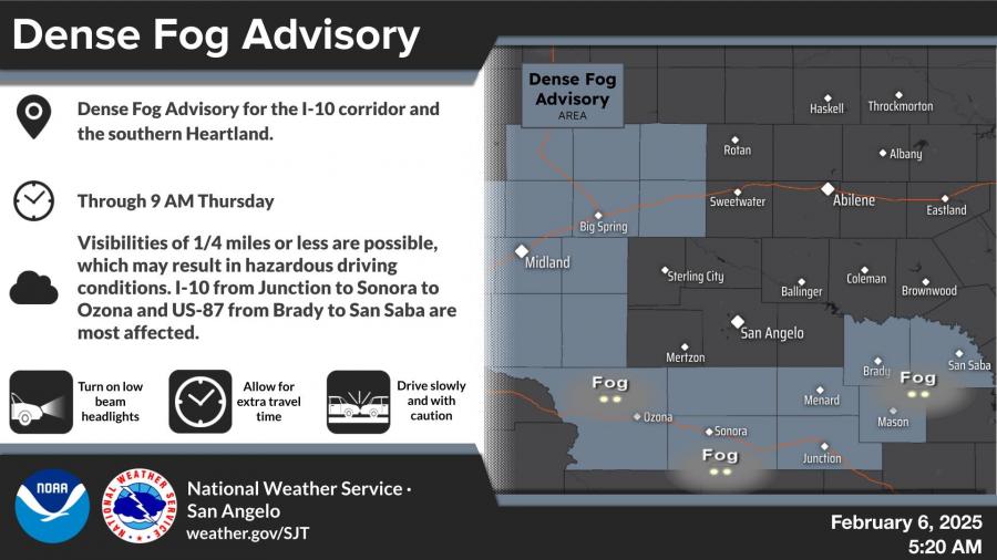The NWS also issued a Dense Fog Advisory for parts of the region, including the I-10 corridor from Junction to Sonora and Ozona, and US-87 from Brady to San Saba. Visibility is expected to drop to a quarter mile or less, creating hazardous driving conditions.