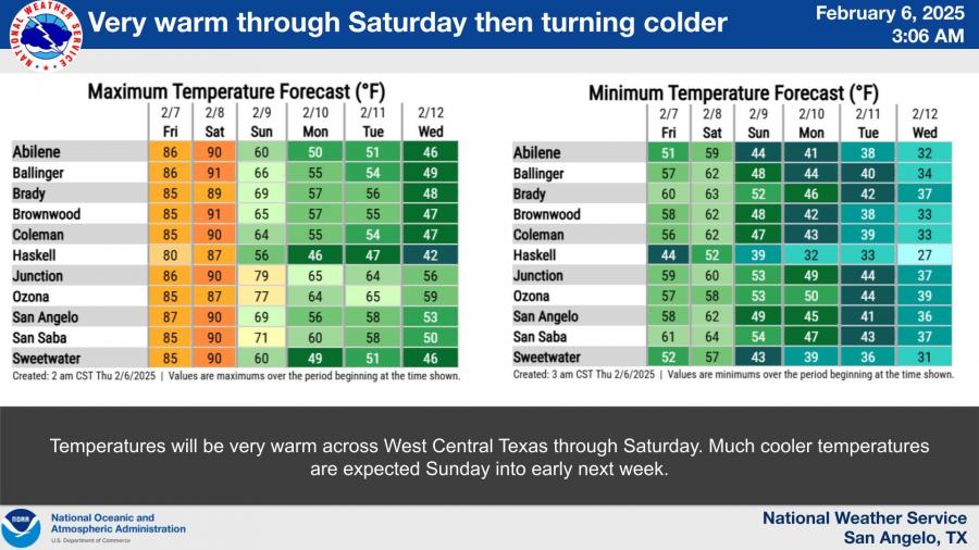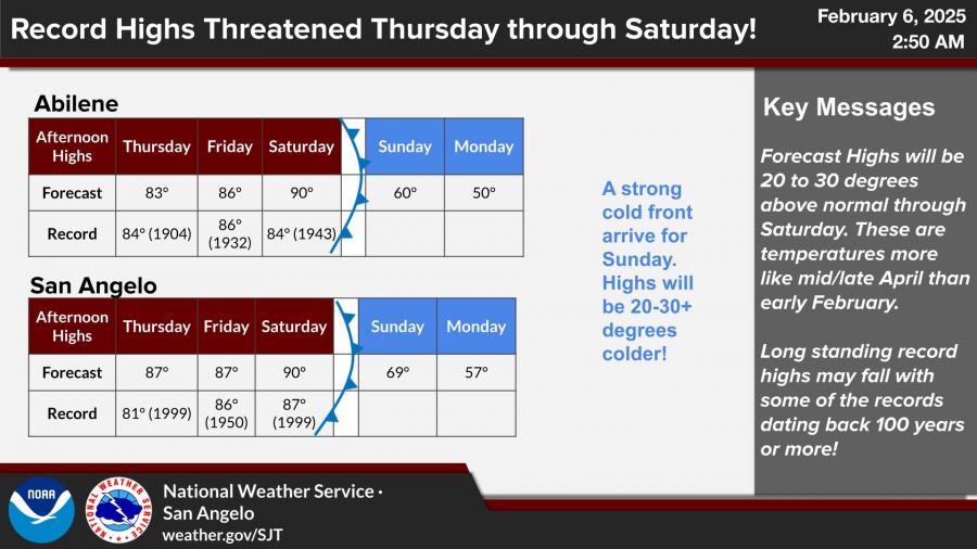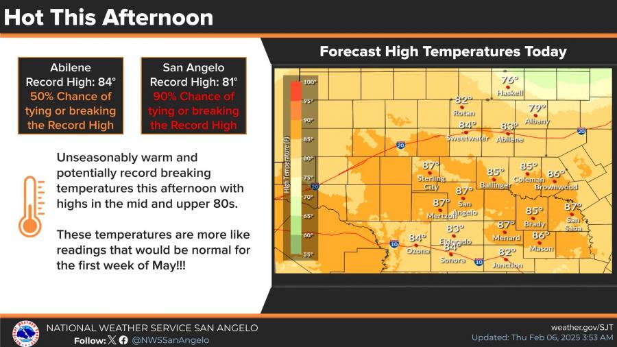 Highs in San Angelo and Abilene could tie or break century-old records, with forecasted temperatures reaching 90 degrees on Saturday. These readings are more typical of late spring than early February. San Angelo is projected to hit 87 degrees on both Thursday and Friday, surpassing the 81-degree record set in 1999. Abilene is also expected to challenge records dating back to the early 1900s.