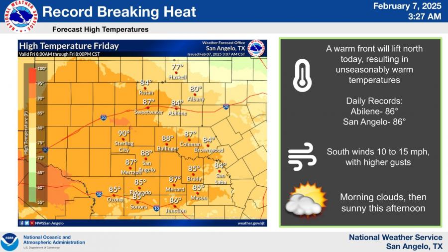 SAN ANGELO, TX – Unseasonably warm temperatures are expected to persist through Saturday, with record-breaking highs anticipated before a cold front arrives late in the day.