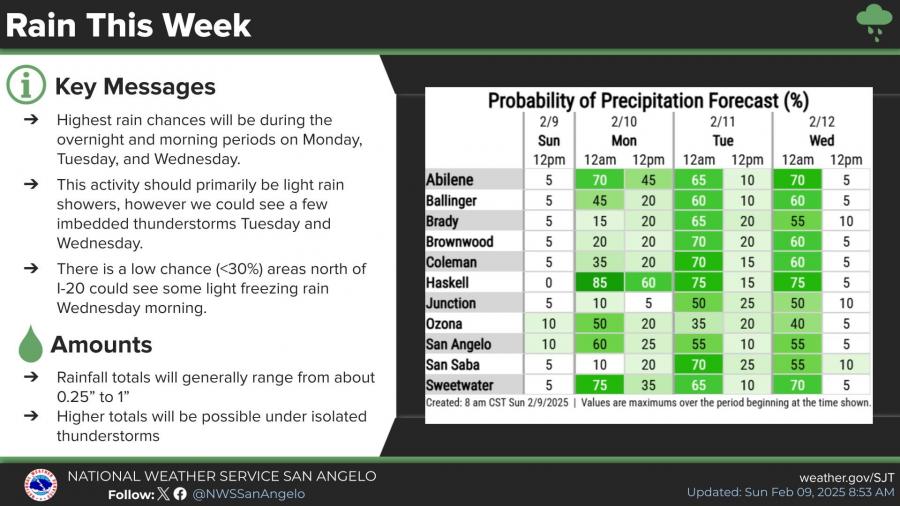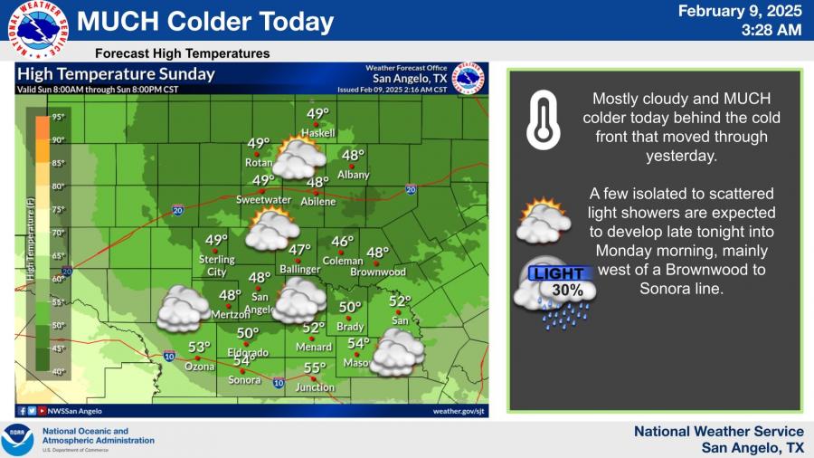 SAN ANGELO, TX – A cold front has pushed through the region, bringing cooler temperatures and increased chances of rain through midweek.