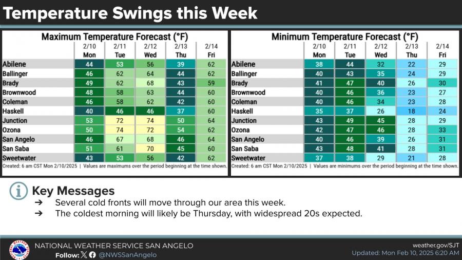 The main cold air event will arrive by Wednesday night, bringing very cold temperatures Thursday morning. Wind chills could drop to 10 degrees or colder in parts of the Big Country, with the highest probability in areas north of San Angelo. Forecast lows for San Angelo on Thursday morning are in the mid-20s, with wind chills in the teens.