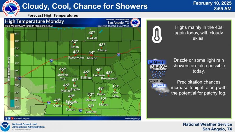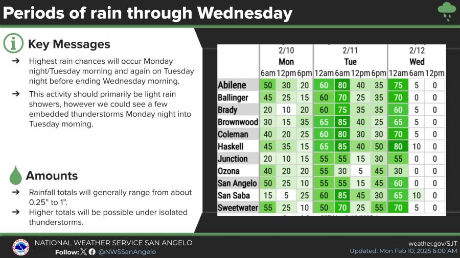 According to the National Weather Service in San Angelo, the highest rain chances will occur Monday night into Tuesday morning, with another round expected Tuesday night before tapering off by Wednesday morning. While precipitation is expected to be light, isolated thunderstorms could develop Monday night into early Tuesday.