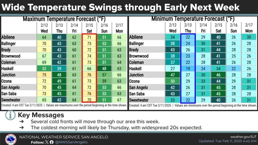 High temperatures on Tuesday will vary widely, ranging from the mid-40s in the Big Country to the low 70s near the I-10 corridor and Hill Country.