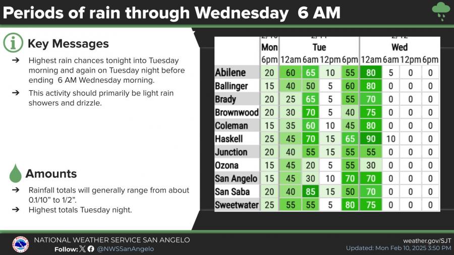 The National Weather Service in San Angelo reports that morning drizzle and showers will clear by noon, with cloudy conditions lingering into the afternoon.