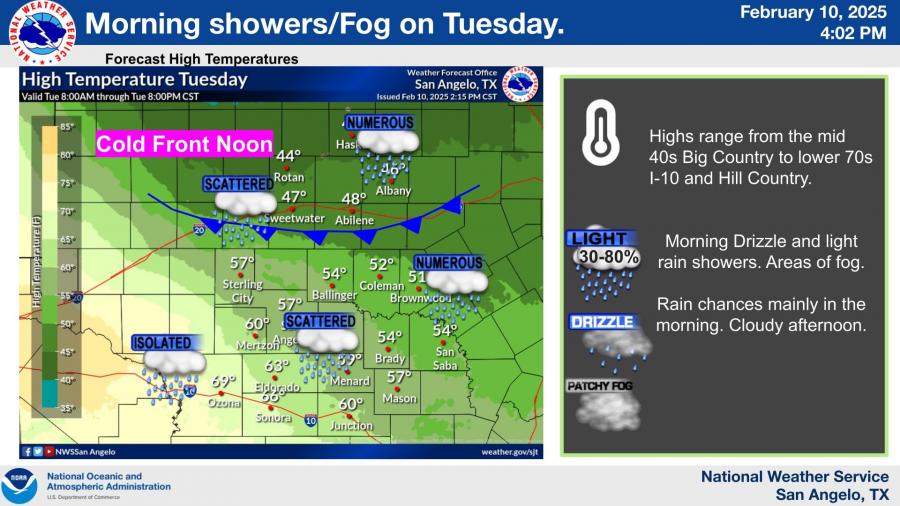 SAN ANGELO, TX – A cold front will push through West Texas on Tuesday, bringing rain, fog, and a temperature drop.