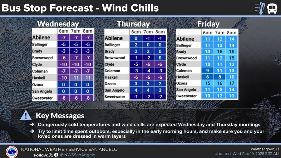 Children at bus stops on Wednesday and Thursday mornings should dress in multiple layers, as wind chills in San Angelo are forecasted to hit zero degrees.