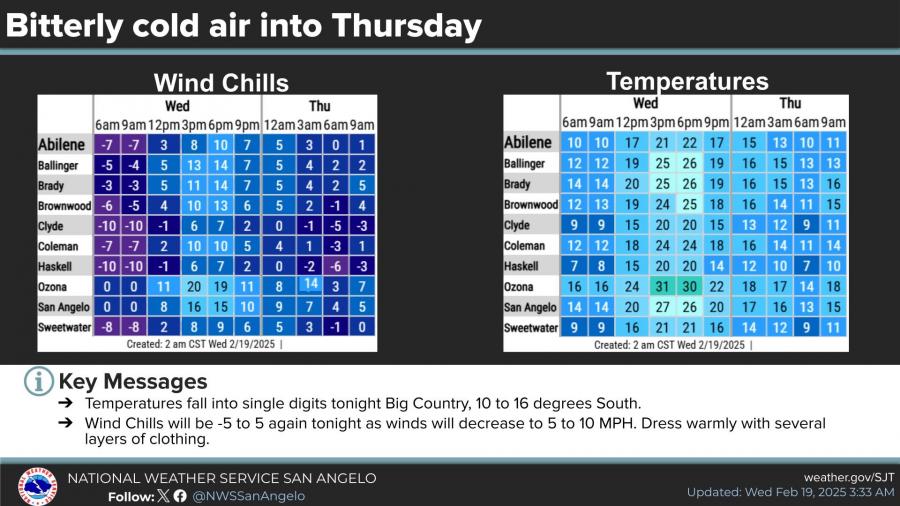 SAN ANGELO, TX – An Extreme Cold Warning is in effect for all of West Central Texas through noon Thursday, with temperatures dropping into the single digits and teens and wind chills as low as -10 degrees, according to the National Weather Service in San Angelo.