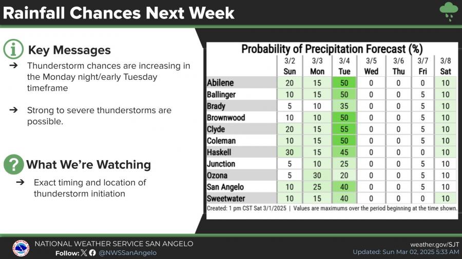 Temperatures will fluctuate throughout the week, with above-normal highs expected early on. Monday’s high in San Angelo is forecast at 83°F, dropping to 65°F on Wednesday before rising again Thursday. Lows will range from the mid-40s to low 50s.