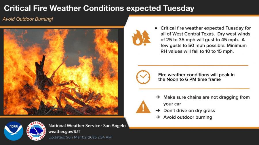 SAN ANGELO, TX – The National Weather Service has issued fire weather warnings and severe weather advisories for West Central Texas, including the Concho Valley, due to critical fire conditions and the potential for thunderstorms this week.