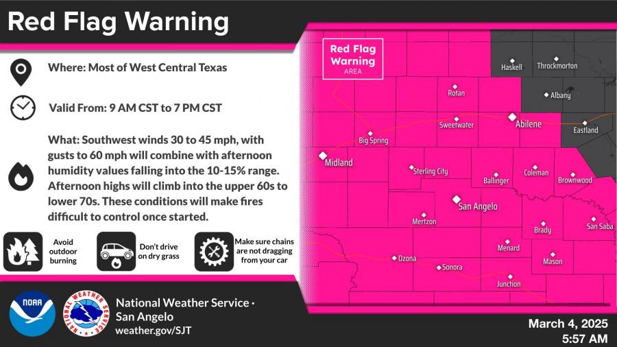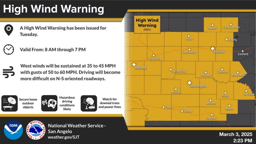 SAN ANGELO, TX – Strong winds and dry conditions are creating hazardous weather across West Central Texas on Tuesday, prompting the National Weather Service to issue a High Wind Warning and a Red Flag Warning for the region.