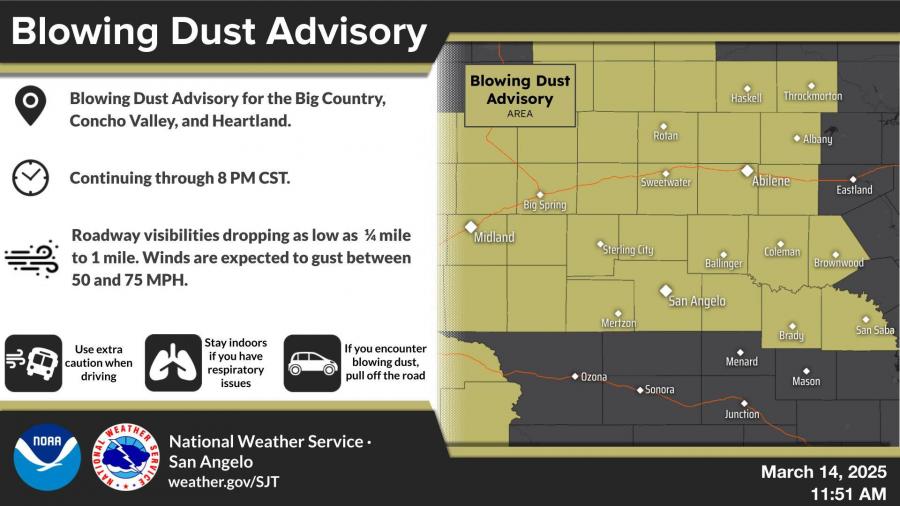 SAN ANGELO, TX – The National Weather Service has issued a Blowing Dust Advisory for the Concho Valley, Big Country, and Heartland regions, warning of reduced visibility and strong wind gusts through 8 p.m. Friday.