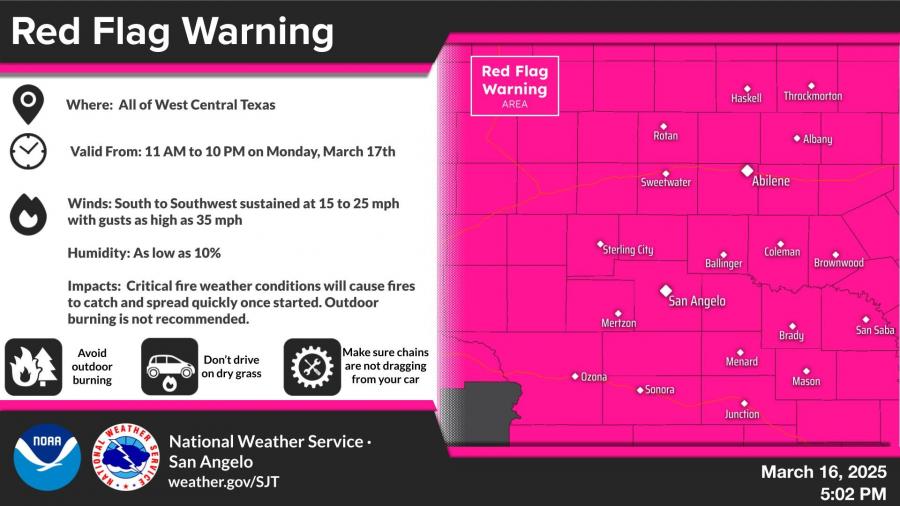 SAN ANGELO, TX – A Red Flag Warning will be in effect across West Central Texas from 11 a.m. to 10 p.m. Monday due to critical fire weather conditions, according to the National Weather Service.