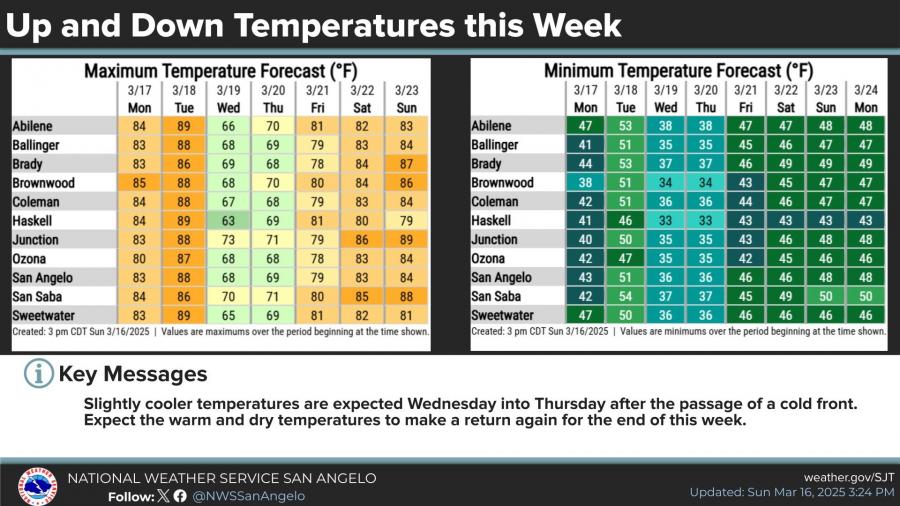 Temperatures will fluctuate throughout the week, reaching the upper 80s to near 90 degrees Monday and Tuesday before a midweek cold front drops highs into the 60s and 70s on Wednesday and Thursday. Warmer temperatures are expected to return by the weekend.