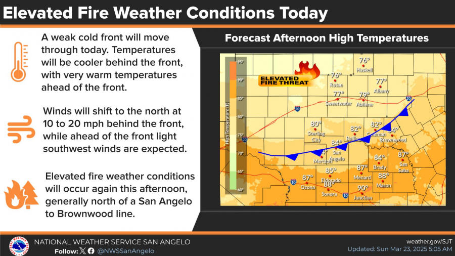 SAN ANGELO, TX — The National Weather Service is warning of elevated fire weather conditions across the Concho Valley today, especially north of a San Angelo-to-Brownwood line, as a weak cold front moves through the region.