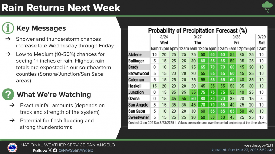 Meanwhile, weather conditions are expected to shift by late Wednesday as rain and thunderstorm chances return to the forecast. The San Angelo area has a 35 percent chance of showers Wednesday night, increasing to 70 percent Thursday afternoon and evening. Rainfall totals of up to three-quarters of an inch are possible.