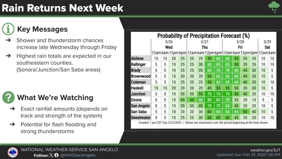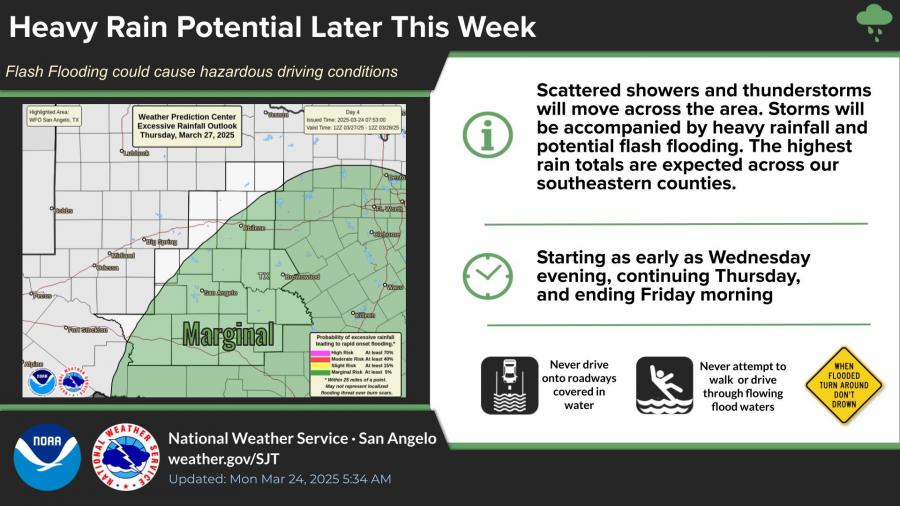 SAN ANGELO, TX – Scattered thunderstorms could bring flash flooding to parts of West Central Texas later this week, with the highest rain totals expected in our southeastern counties, according to the National Weather Service in San Angelo.