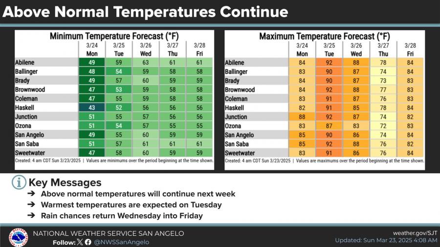 In addition to the rain, above-normal temperatures are expected to continue throughout the week. Highs will peak Tuesday in the upper 80s to low 90s before dropping into the 70s later in the week as rain chances rise.