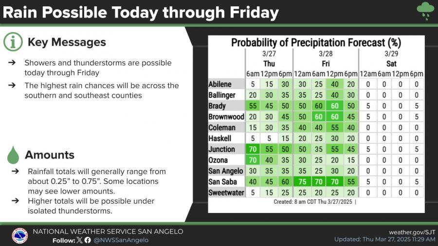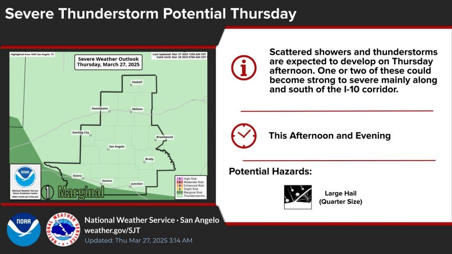 San Angelo is not included in the marginal risk zone for severe storms, and any precipitation that does fall is likely to be short-lived.