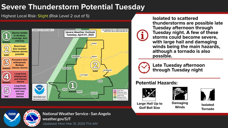 SAN ANGELO, TX — Mild and sunny conditions are expected across West Central Texas today, the final day of March, with afternoon highs ranging from the mid-70s to mid-80s.