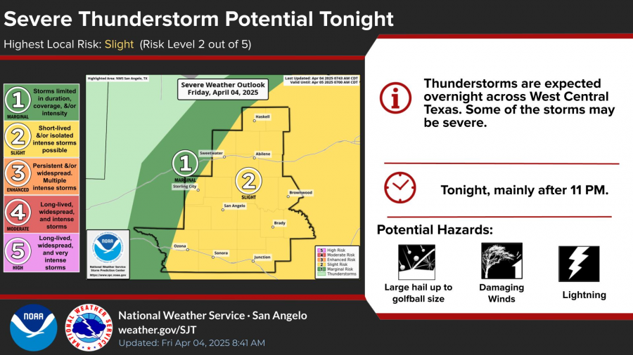 SAN ANGELO, TX – The National Weather Service is warning residents in San Angelo and across West Central Texas to prepare for potentially severe thunderstorms late Friday night into early Saturday morning.