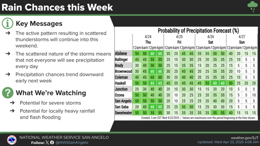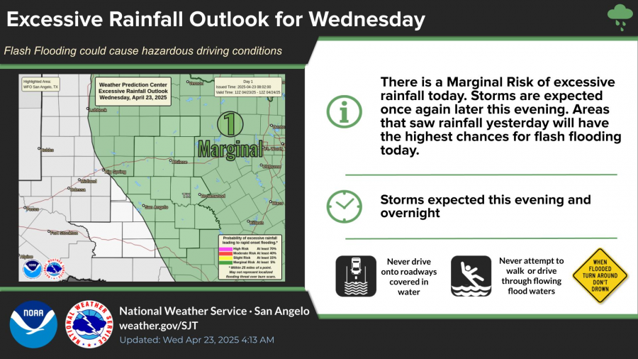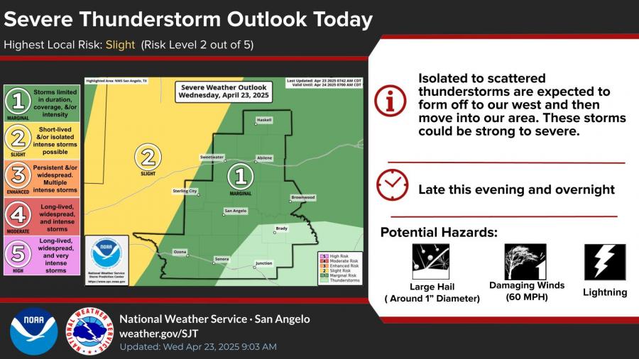 While the highest severe weather threat remains to the west, forecasters say a few storms in the San Angelo region could still produce large hail up to 1 inch in diameter, damaging winds up to 60 mph, and frequent lightning. The area is under a “Slight Risk” (Level 2 of 5) for severe weather.