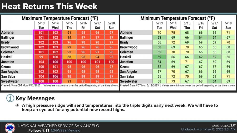 SAN ANGELO, TX – The National Weather Service is warning residents across West Central Texas to prepare for a return to triple-digit temperatures this week, with San Angelo expected to reach 102 degrees on both Tuesday and Wednesday.