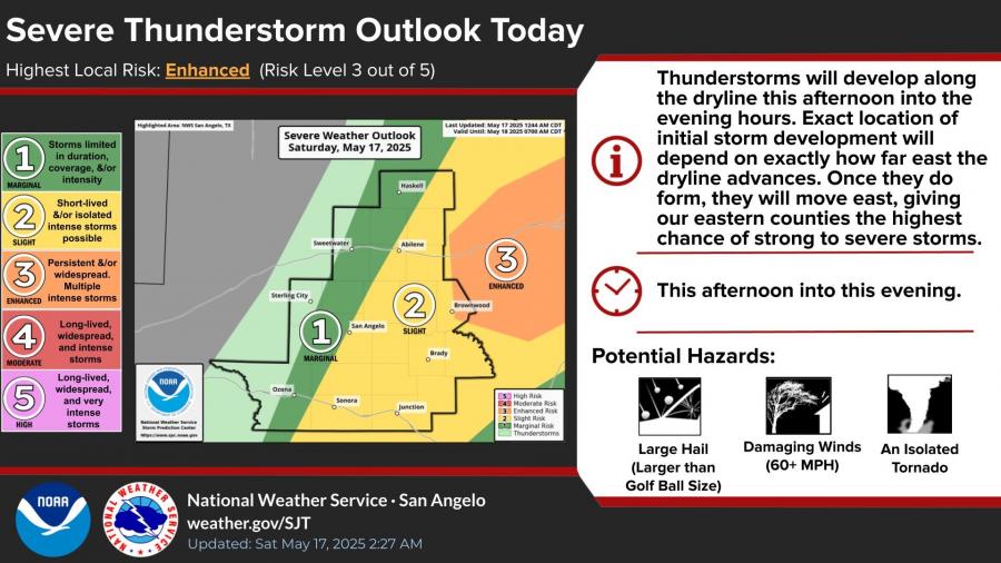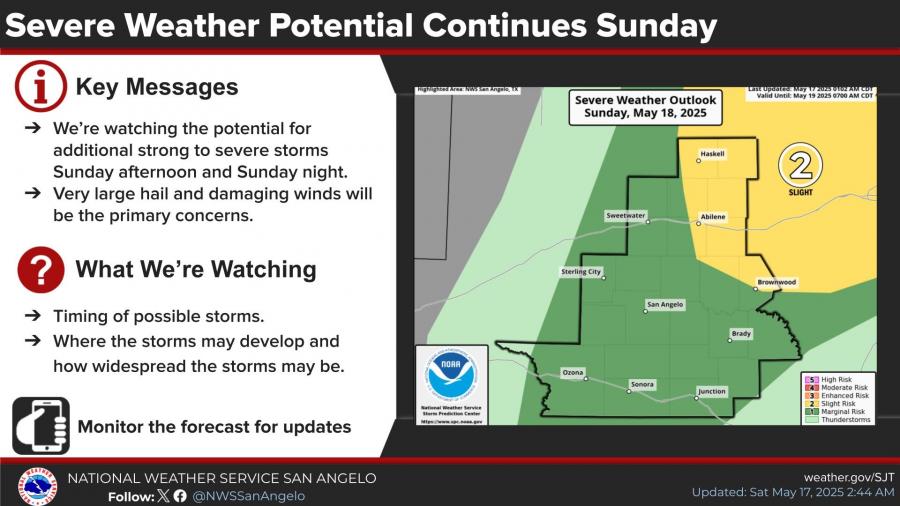 San Angelo and surrounding communities remain under a slight risk for severe thunderstorms, classified as Level 2 out of 5. Hazards include very large hail—potentially up to baseball size—damaging winds exceeding 60 mph, and an isolated tornado.