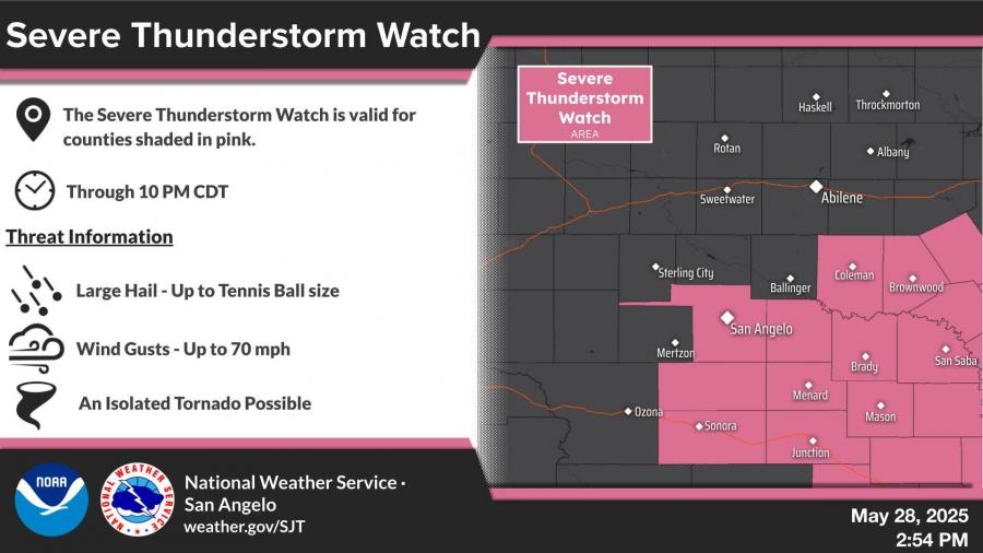 Counties under the watch include Tom Green, Brown, Coleman, Mason, Menard, McCulloch, San Saba, Schleicher, and Sutton, among others. Forecasters warn of large hail up to tennis ball size, damaging wind gusts reaching 70 mph, and the possibility of an isolated tornado.