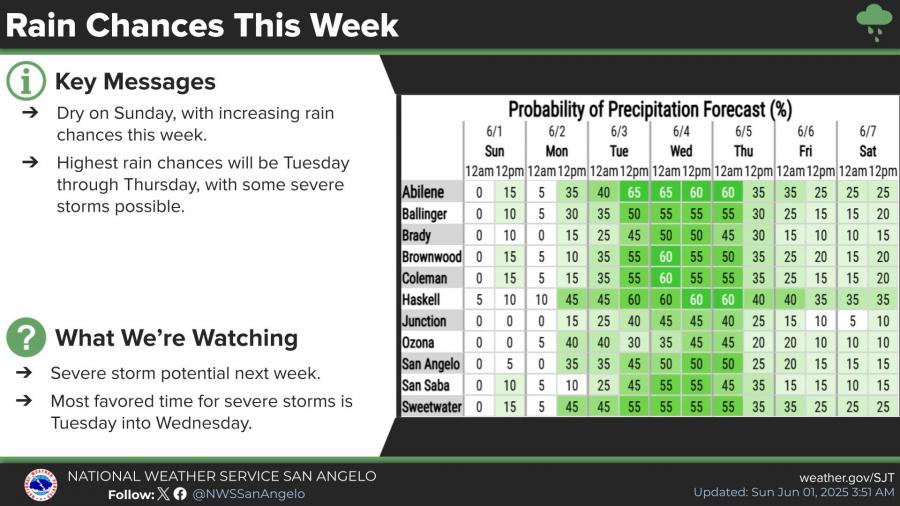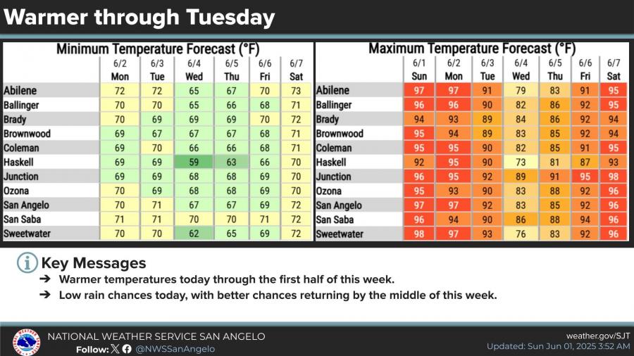 Forecast highs for San Angelo are 97 degrees Sunday and Monday, with similar readings expected across the Big Country and Concho Valley. Cooler conditions are forecast to arrive midweek, with highs dipping into the low 80s by Wednesday.