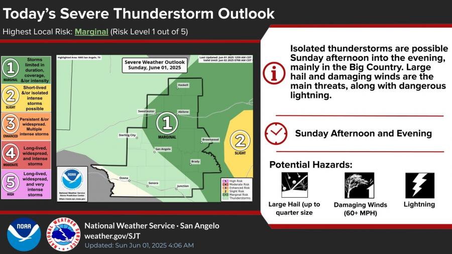 Forecasters say today’s isolated thunderstorms — mainly north of a Sterling City to Mason line — are not expected to be widespread. However, any storms that do develop this afternoon and evening could produce quarter-size hail, damaging winds over 60 mph, and dangerous lightning.