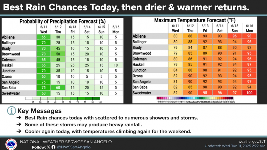 Forecast data issued early Wednesday showed San Angelo had a 75% chance of precipitation today—the highest probability for the week. By Thursday, rain chances fall sharply to 15%, and remain low through the weekend. Temperatures, meanwhile, are forecast to rise steadily, reaching the upper 90s by Sunday and Monday.