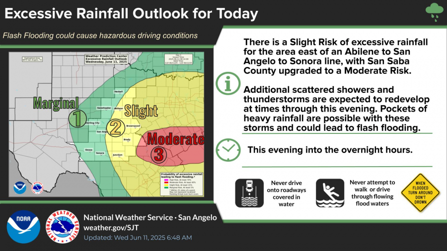 The Weather Prediction Center also placed areas east of an Abilene-to-Sonora line, including San Angelo, under a Slight Risk for excessive rainfall, with San Saba County elevated to a Moderate Risk.
