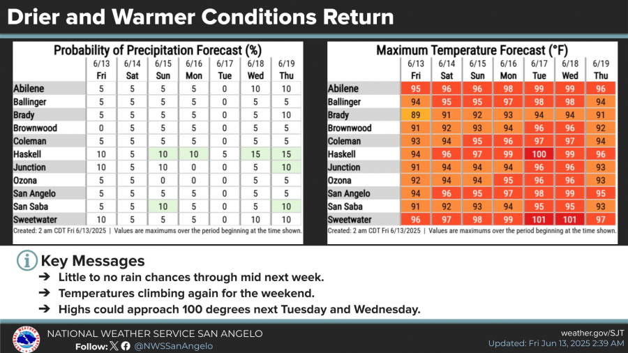 Temperatures are projected to climb over the weekend, with highs on Tuesday and Wednesday potentially reaching or exceeding 100 degrees in some areas. Sweetwater could see temperatures as high as 101 degrees on both days, while San Angelo is forecast to hit 99 degrees.