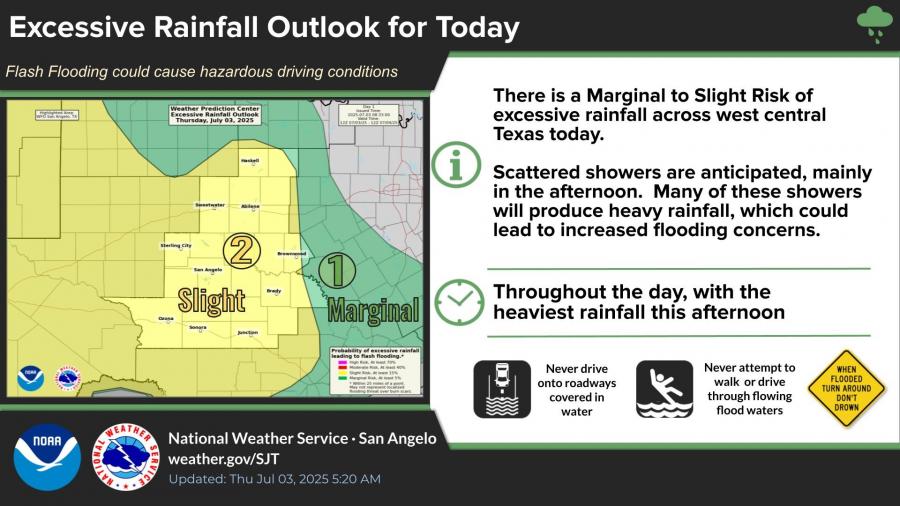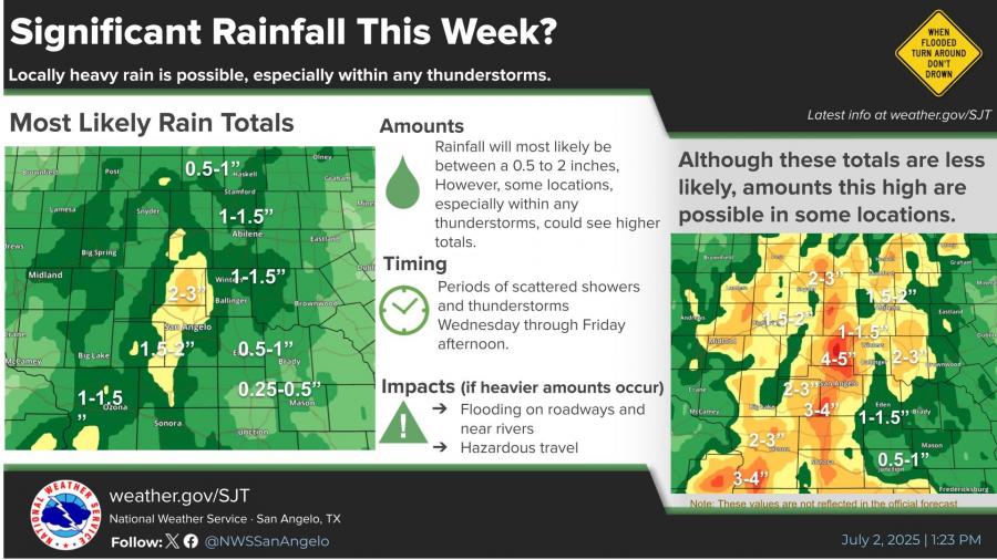 SAN ANGELO, TX — Periods of heavy rain are forecast to continue across West Central Texas through Friday, with some areas potentially receiving more than 2 inches of rainfall, raising concerns over flooding in low-lying areas and along roadways, according to the National Weather Service in San Angelo.