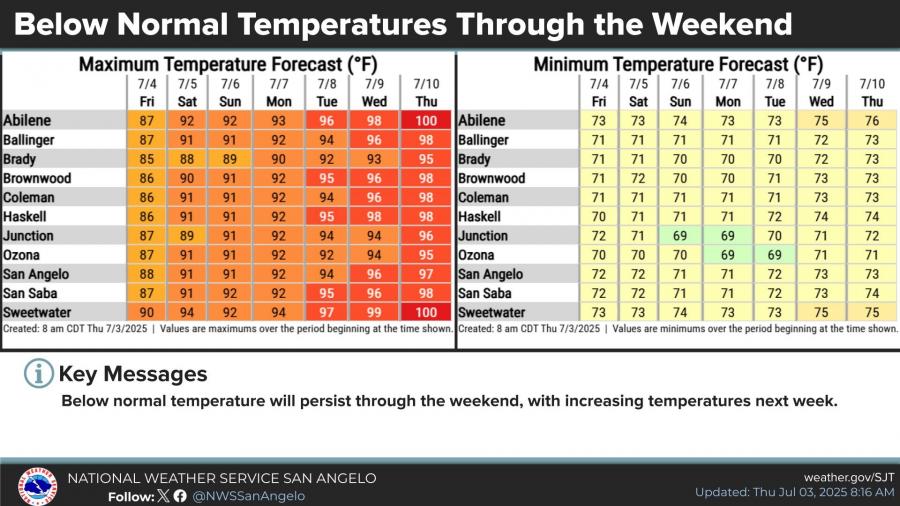 The detailed forecast for San Angelo calls for a 50 percent chance of showers and thunderstorms on Independence Day, with highs near 88 degrees. Rain chances decrease into the weekend, with partly sunny skies and highs near 91 degrees on Saturday and Sunday.