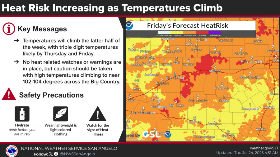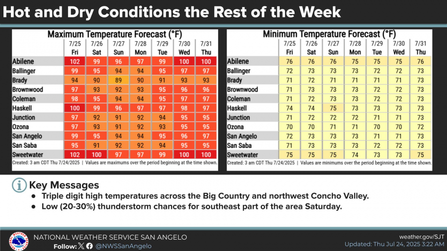 Temperatures across the Big Country and Concho Valley will remain high through the end of the week, with triple-digit highs likely Thursday and Friday. Friday’s highs are forecast to hit 102°F in both Abilene and Sweetwater, and 99°F in San Angelo. Today's high in San Angelo will be around 99°F.