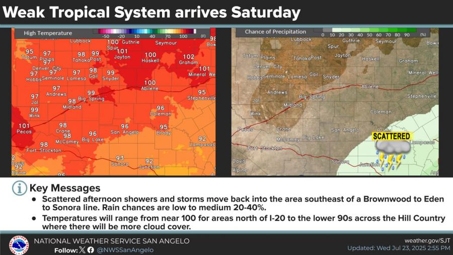 SAN ANGELO, TX — A weak tropical wave moving into Texas this weekend is expected to bring scattered showers and thunderstorms to parts of West Central Texas, according to the National Weather Service in San Angelo.