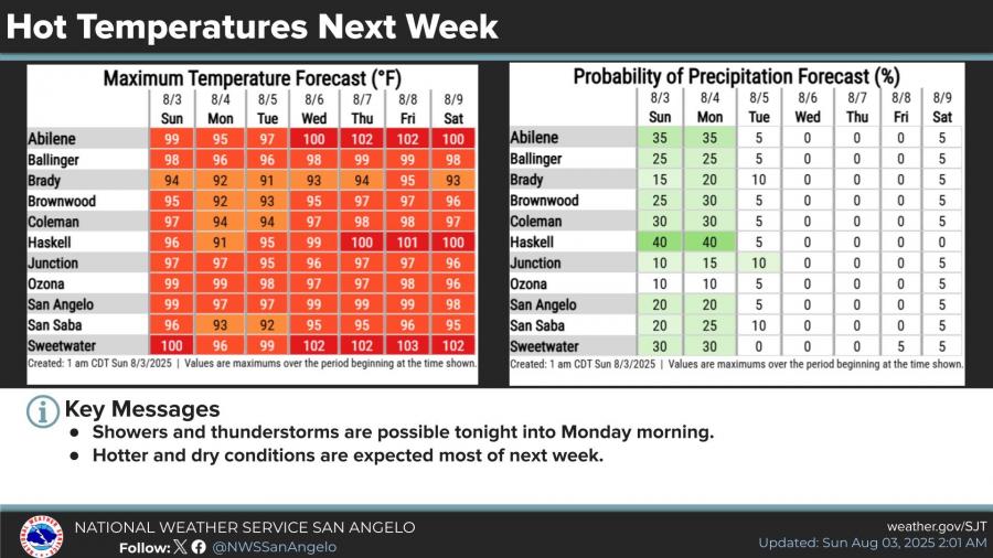 Rain chances will decrease after Monday, with hotter and drier conditions expected through the rest of the week. High temperatures in San Angelo are expected to remain in the upper 90s, reaching near 100 degrees through much of the upcoming week.