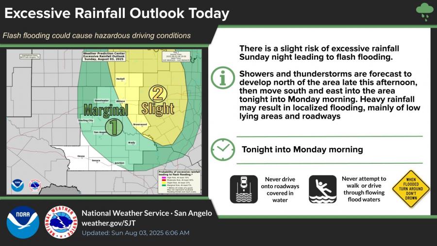 The Storm Prediction Center has placed San Angelo and surrounding areas under a marginal risk for severe weather, with the highest impacts expected overnight into Monday morning. A slight risk of excessive rainfall has also been issued for much of West Central Texas.