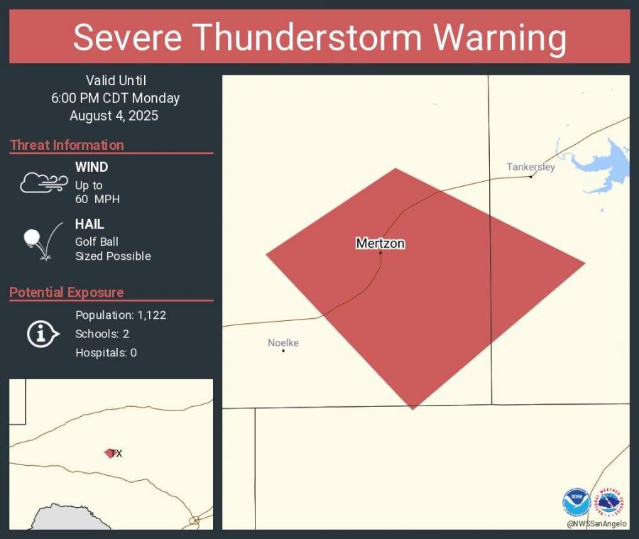 SAN ANGELO, TX — The National Weather Service has issued a Severe Thunderstorm Warning for parts of southwestern Tom Green and southeastern Irion counties, including areas near Mertzon and Knickerbocker, through 6 p.m. CDT Monday.