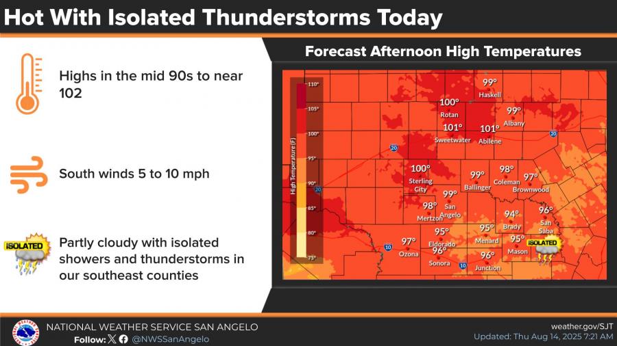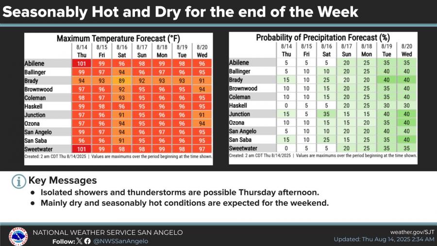 SAN ANGELO, TX— Hot and mostly dry weather will persist across West Central Texas through the weekend, with only isolated showers and thunderstorms possible Thursday afternoon, mainly in southeastern counties, according to the National Weather Service in San Angelo.