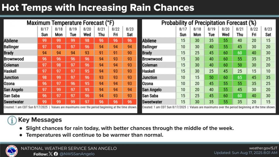 High temperatures will remain above normal, ranging from the mid-90s to near 100 degrees across the region. San Angelo is forecast to reach 97 on Sunday and 99 on Monday before dipping slightly into the low to mid-90s by Thursday.